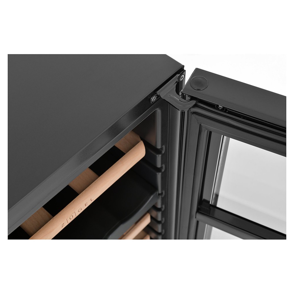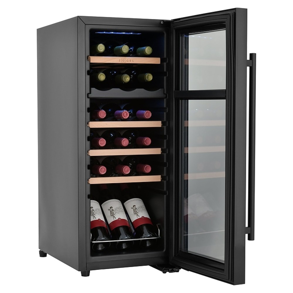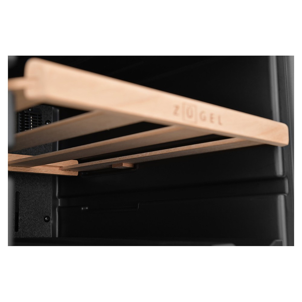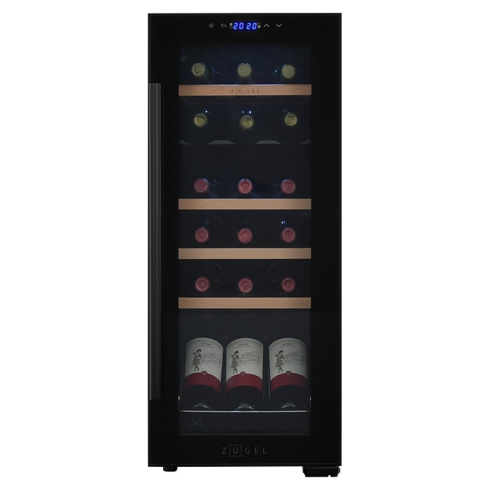 Винный шкаф Zugel ZCWF184DB предназначен для хранения при оптимальных условиях бутилированного вина различных сортов в барах, ресторанах, специализированных магазинах, подсобных складских помещениях, а также домашних условиях. Модель оснащена холодильной камерой c 2 температурными зонами, интегрированными направляющими для полок, правосторонней распашной дверью с длинной трубчатой вертикальной рукояткой и обзорным остеклением, кабелем питания, расположенной на фасаде двери электронной панелью управления с сенсорными функциональными клавишами и цифровым жидкокристаллическим дисплеем с голубой подсветкой индикации. Корпус и рукоятка выполнены из металла с матовым антикоррозийным покрытием черного цвета, дверь с полным фронтальным остеклением без винтового крепежа, рама двери и внутренняя облицовка камеры черного цвета, остекление – из тонированного закаленного стекла, полки – из массива буковой древесины с фронтальной гравировкой логатипа.
