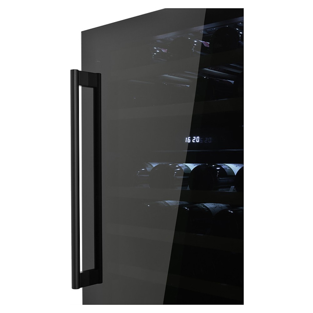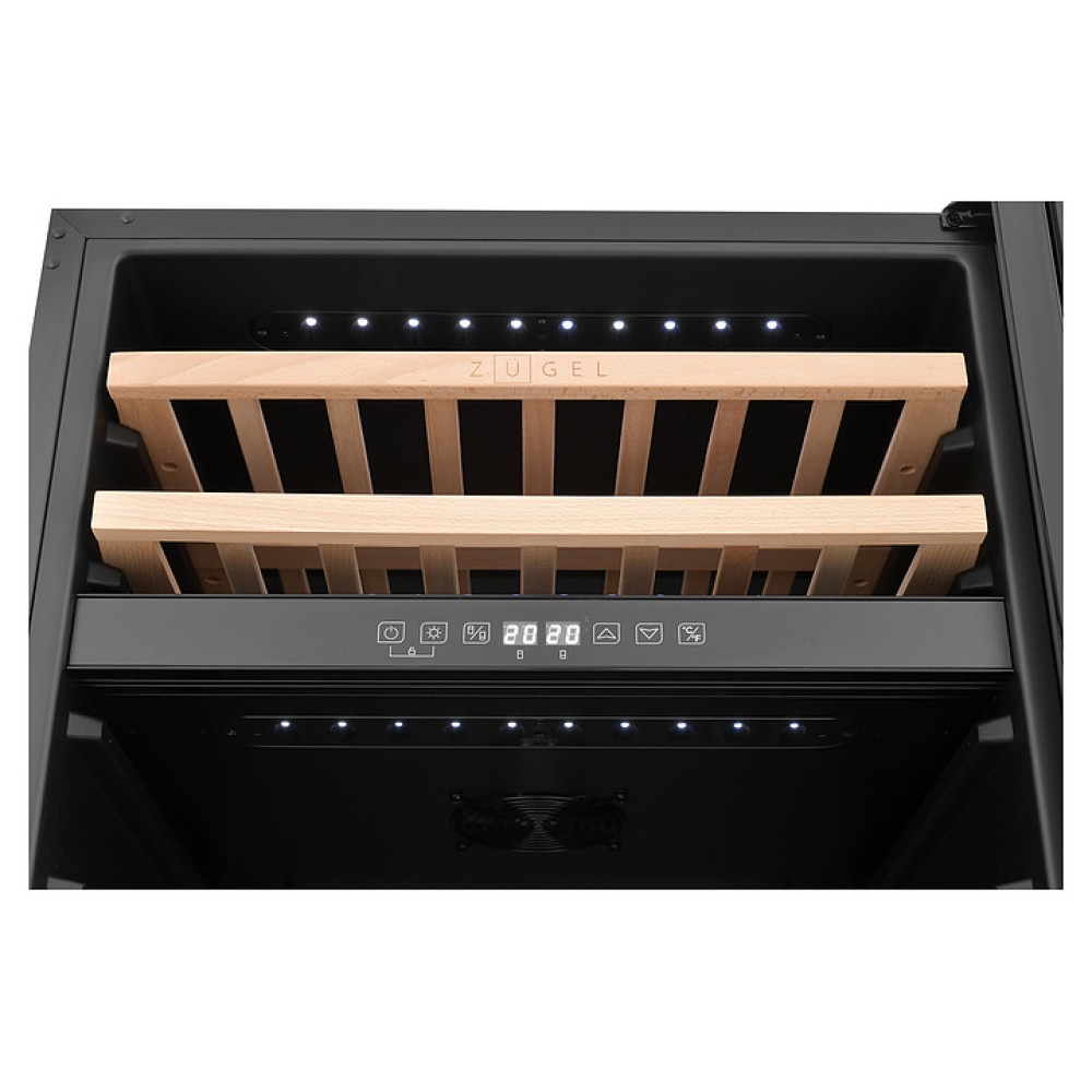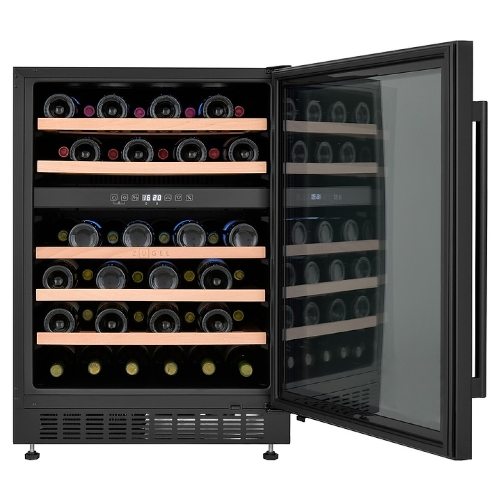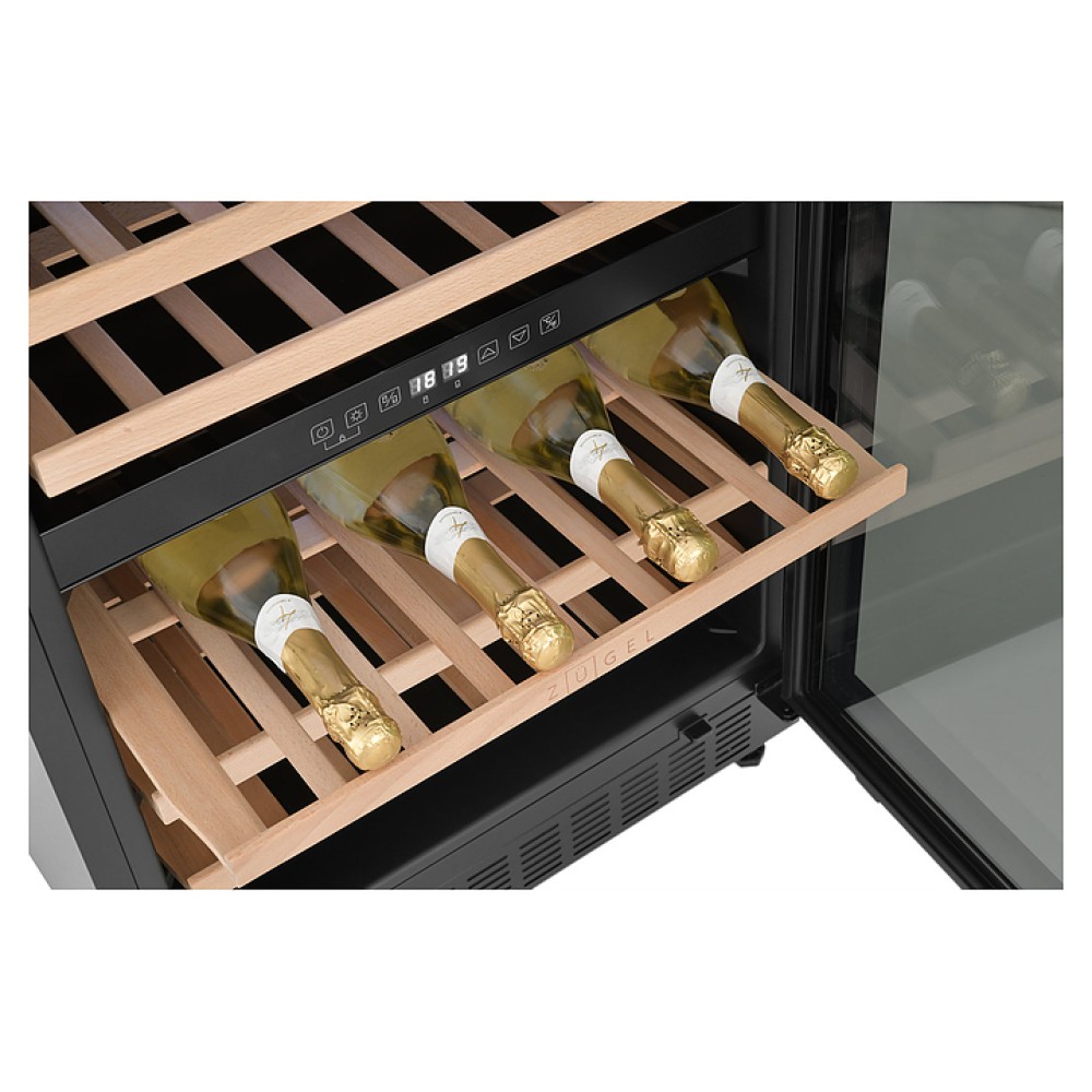 Винный шкаф Zugel ZCWI460DB предназначен для хранения при оптимальных условиях бутилированного вина различных сортов в барах, ресторанах, специализированных магазинах, подсобных складских помещениях, а также домашних условиях. Модель оснащена холодильной камерой c 2 температурными зонами, интегрированными направляющими для полок, правосторонней распашной дверью на перенавешиваемых петлях с длинной трубчатой вертикальной рукояткой и обзорным остеклением, цокольной вентиляционной решеткой, кабелем питания, расположенной внутри камеры электронной панелью управления с сенсорными функциональными клавишами и 2 цифровыми светодиодными дисплеями с белой подсветкой индикации. Корпус выполнен из металла с антикоррозийным покрытием, дверь с полным фронтальным остеклением без винтового крепежа, рама двери и внутренняя облицовка камеры черного цвета, рукоятка – из металла с матовым покрытием черного цвета, остекление – из закаленного стекла с дымчатой тонировкой, полки – из массива буковой древесины с фронтальной гравировкой логатипа.