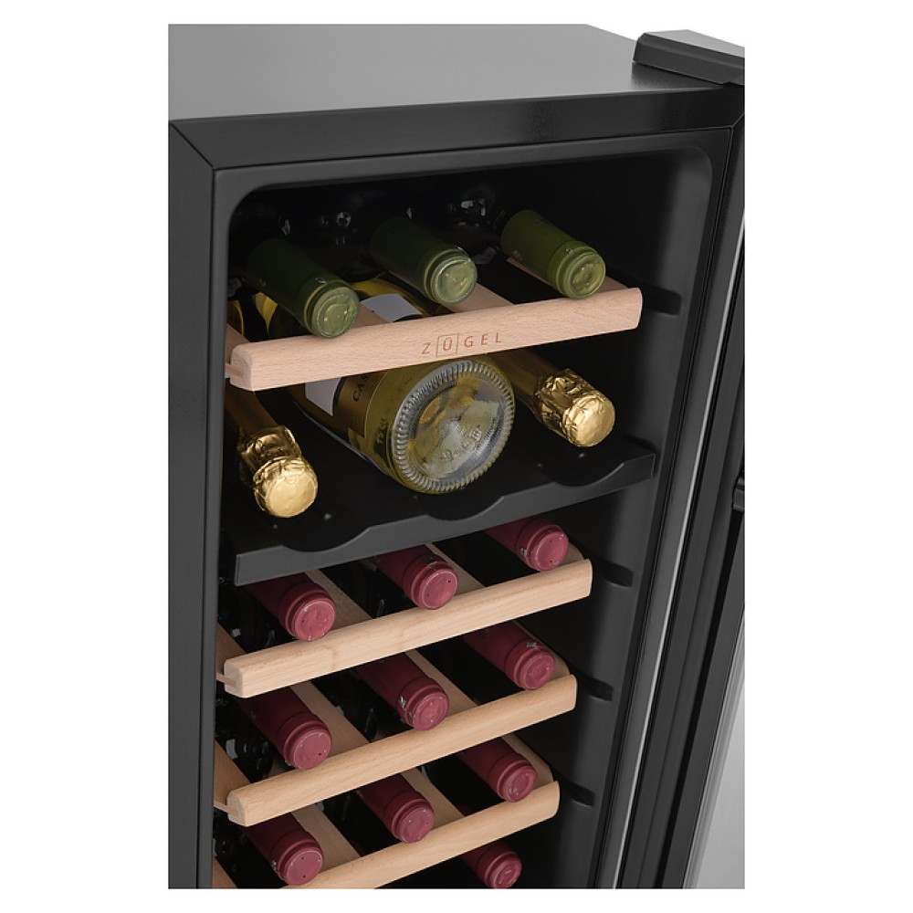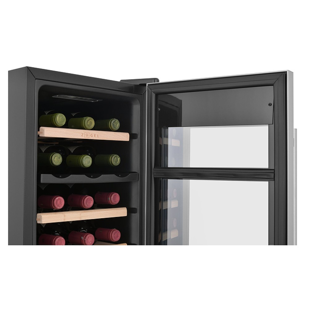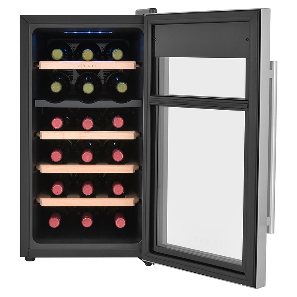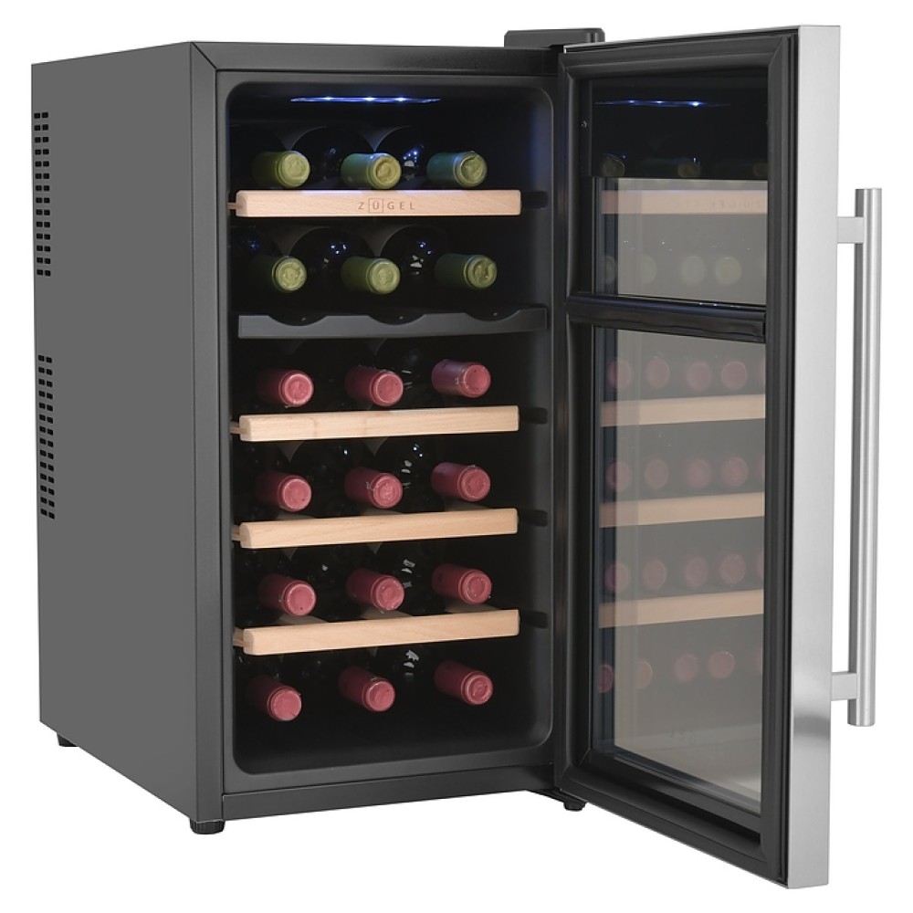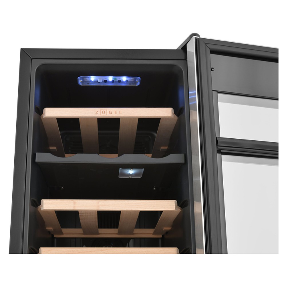 Винный шкаф Zugel ZTWF182DX предназначен для хранения при оптимальных условиях бутилированного вина различных сортов в барах, ресторанах, специализированных магазинах, подсобных складских помещениях, а также домашних условиях. Модель оснащена холодильной камерой c 2 температурными зонами, интегрированными направляющими для полок, правосторонней распашной дверью с вертикальной трубчатой рукояткой и обзорным остеклением, кабелем питания, расположенной на фасаде двери электронной панелью управления с сенсорными функциональными клавишами и 2 цифровыми жидкокристаллическими дисплеями с белой подсветкой индикации. Корпус выполнен из металла с матовым антикоррозийным покрытием черного цвета, фронт дверной рамы – из нержавеющей стали, рукоятка – из металла с серебристой поверхностью, внутренняя облицовка камеры черного цвета, остекление – из тонированного закаленного стекла, полки – из массива буковой древесины с фронтальной гравировкой логатипа.