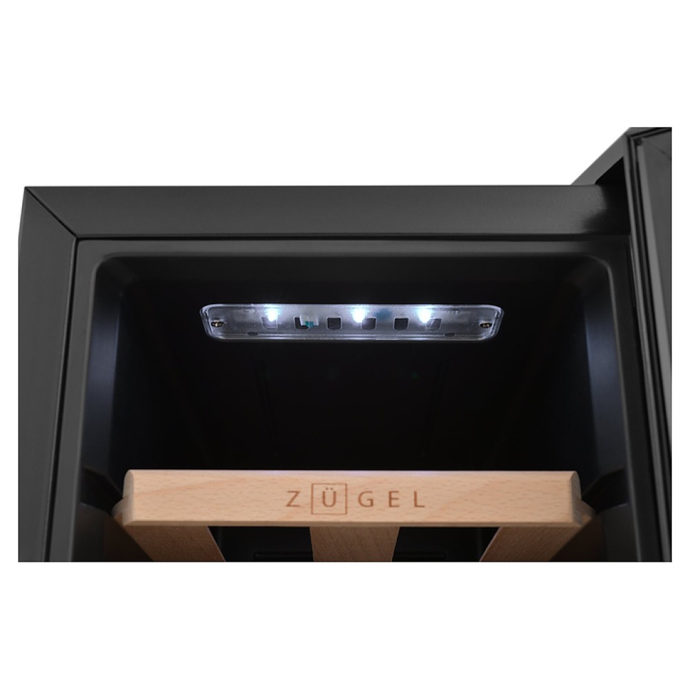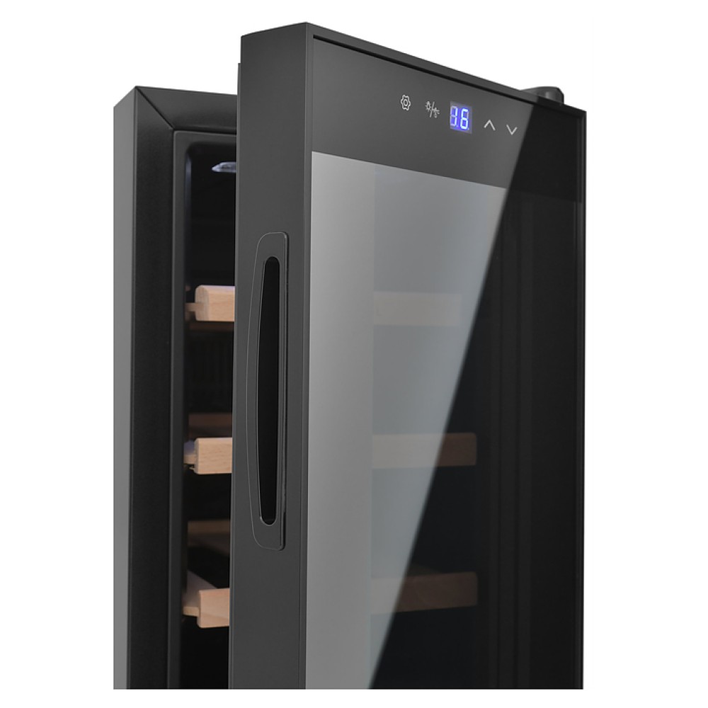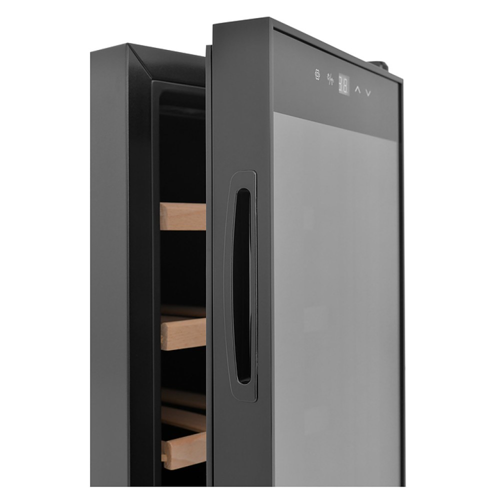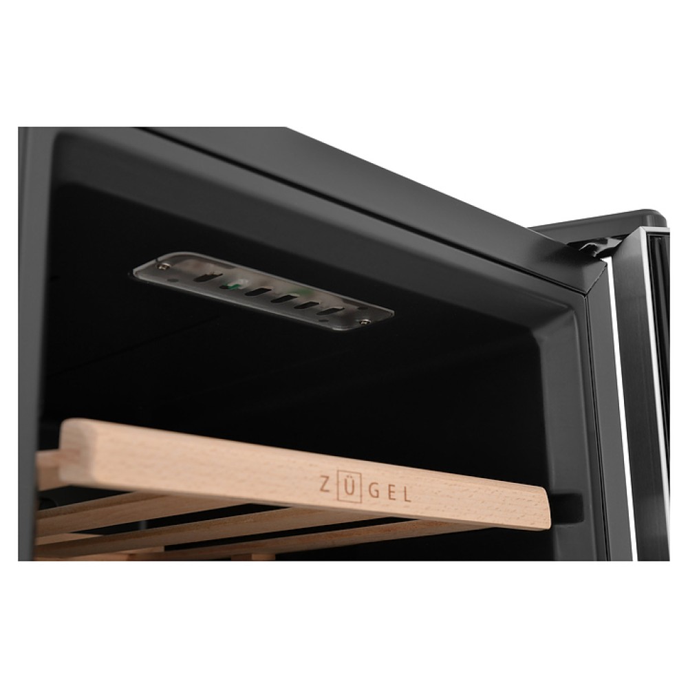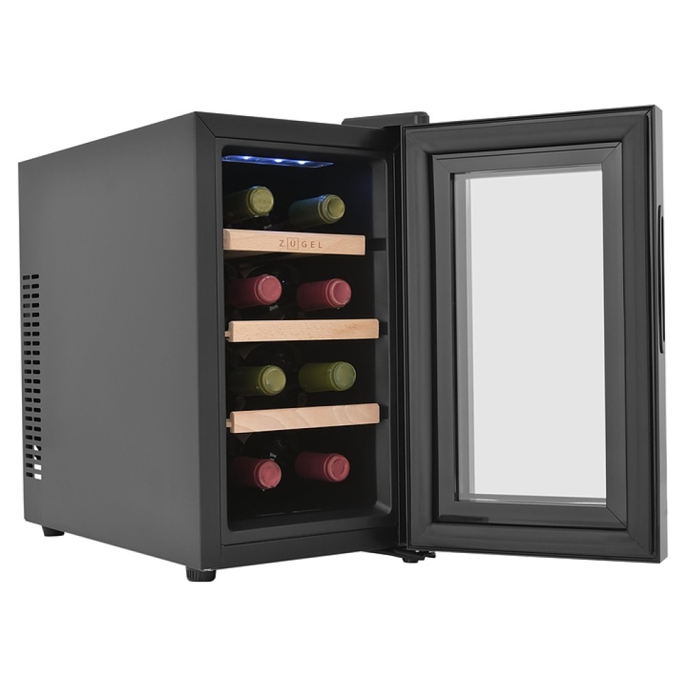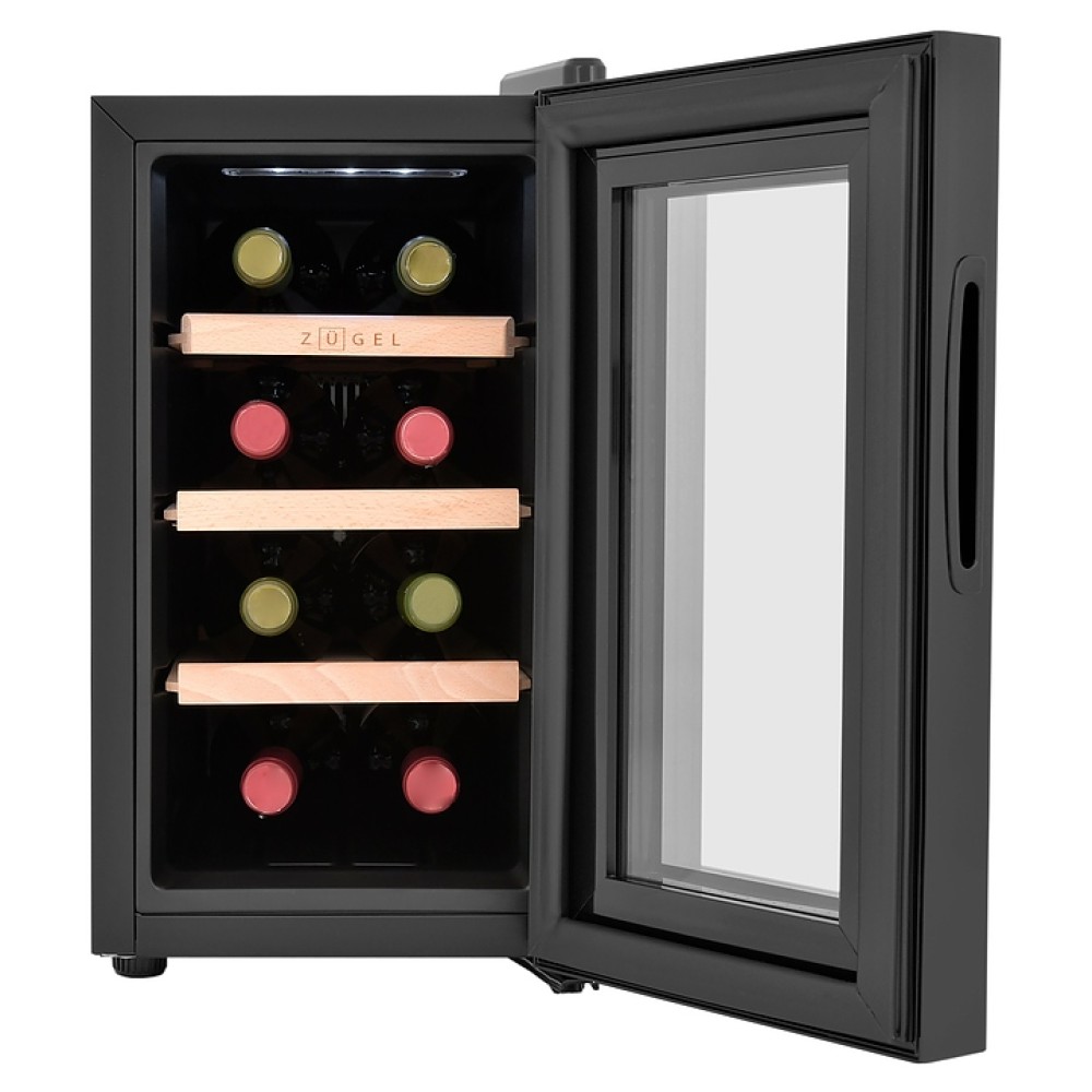 Винный шкаф Zugel ZTWF82B предназначен для хранения при оптимальных условиях бутилированного вина различных сортов в барах, ресторанах, специализированных магазинах, подсобных складских помещениях, а также домашних условиях. Модель оснащена монотемпературной холодильной камерой c интегрированными направляющими для полок, правосторонней распашной дверью с обзорным остеклением, кабелем питания, расположенной на фасаде двери электронной панелью управления с сенсорными функциональными клавишами и цифровым жидкокристаллическим дисплеем с голубой подсветкой индикации. Корпус выполнен из металла с матовым антикоррозийным покрытием черного цвета, рама двери и внутренняя облицовка камеры черного цвета, остекление – из тонированного закаленного стекла, полки – из массива буковой древесины с фронтальной гравировкой логатипа.